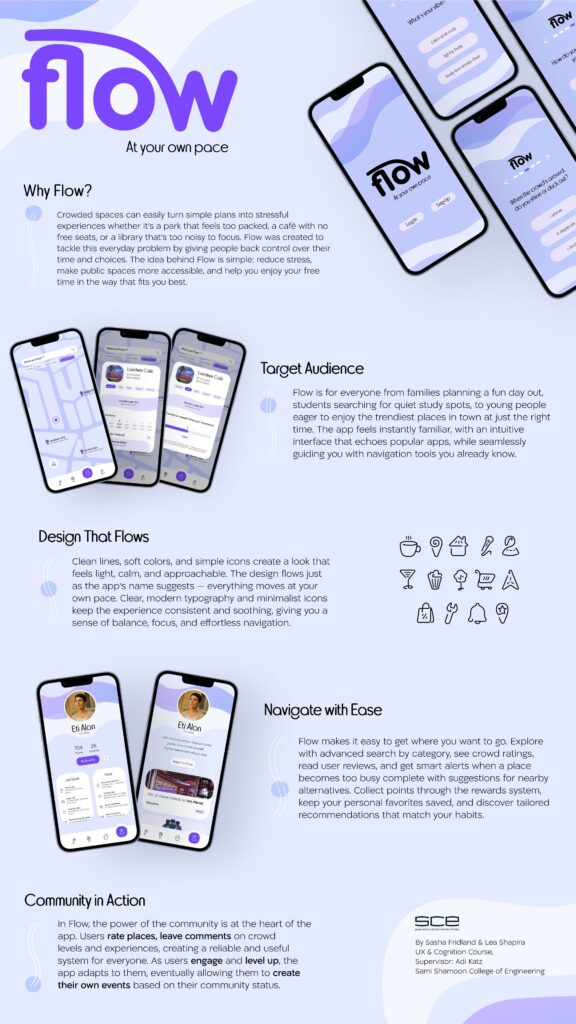 הפרויקט, שזכה לשם "Flow", נולד במסגרת הקורס "חוויית משתמש וקוגניציה" בהנחייתה של ד"ר עדי כץ. מדובר באפליקציה חכמה המסייעת למשתמשים לקבל החלטות מושכלות לפני הגעה למקומות ציבוריים כמו מסעדות, חנויות ואירועים. המערכת מבוססת על נתוני צפיפות בזמן אמת, ומאפשרת למשתמש לבחור: האם להימנע מעומס ולחפש שקט, או דווקא להגיע כשיש קהל ותוסס.